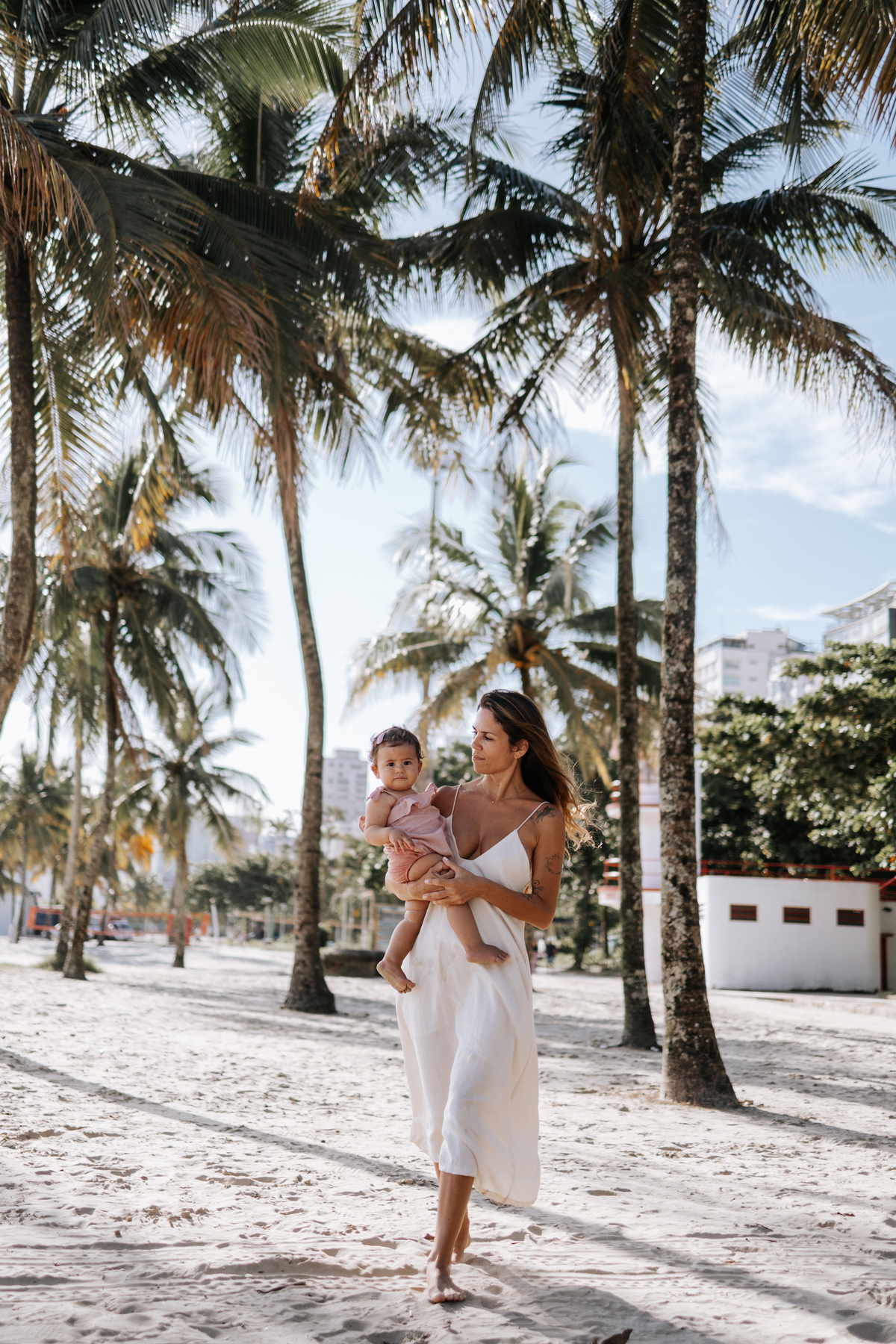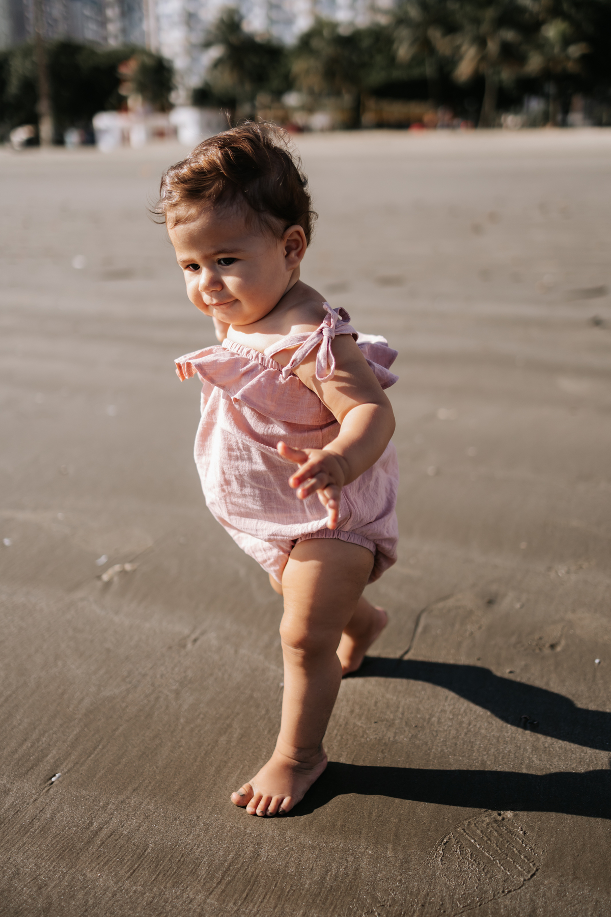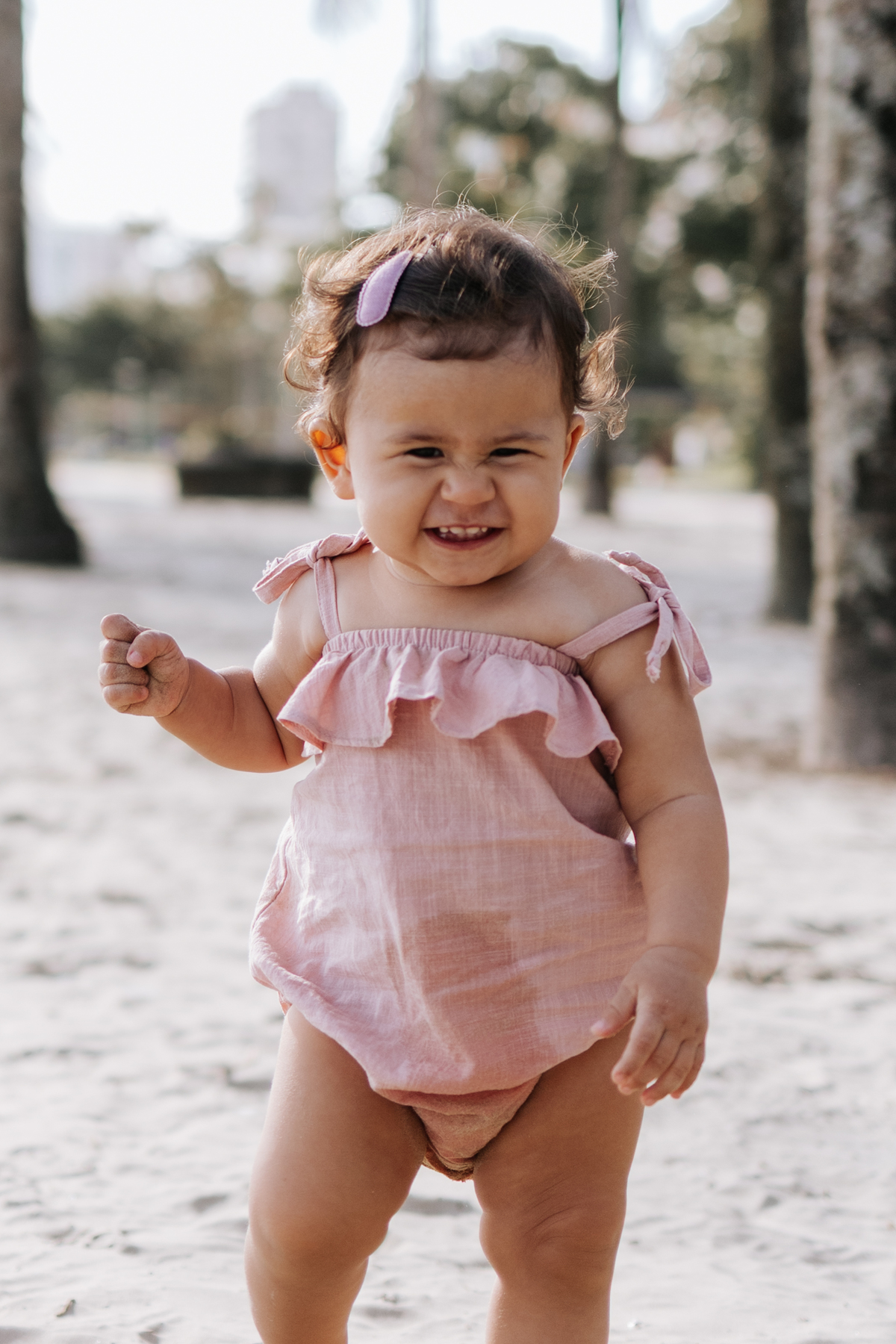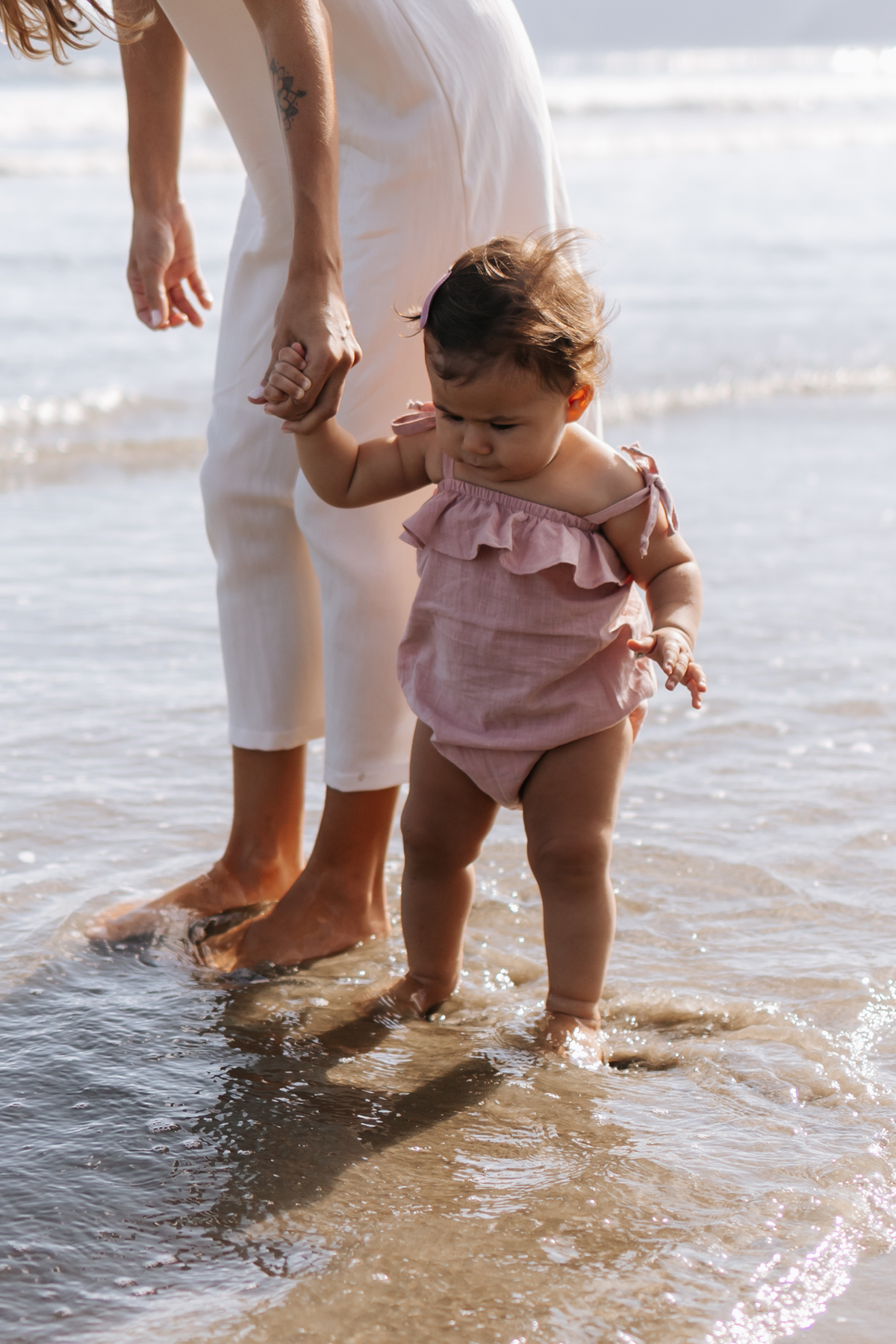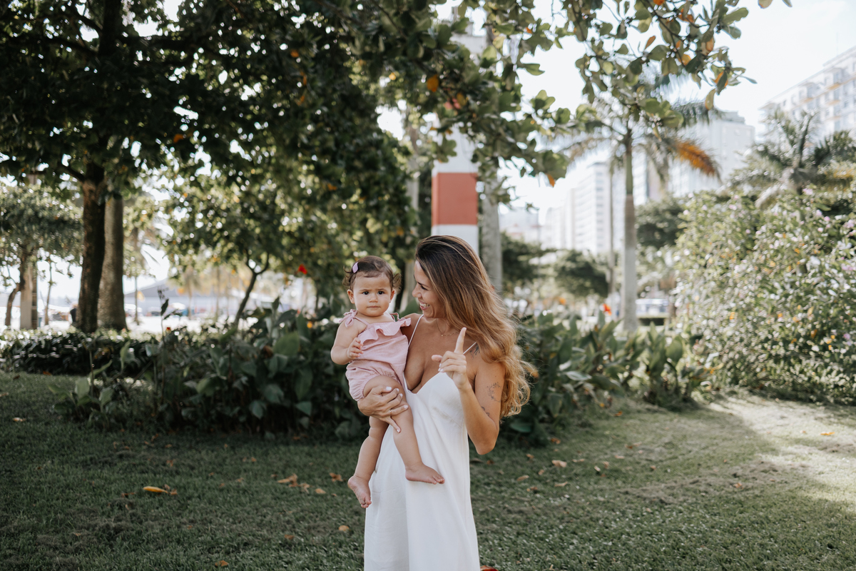O ensaio de 1 ano da Cecília foi realizado na praia de Santos, em um cenário leve e natural entre a areia e o jardim, criando diferentes momentos para registrar essa fase tão especial.