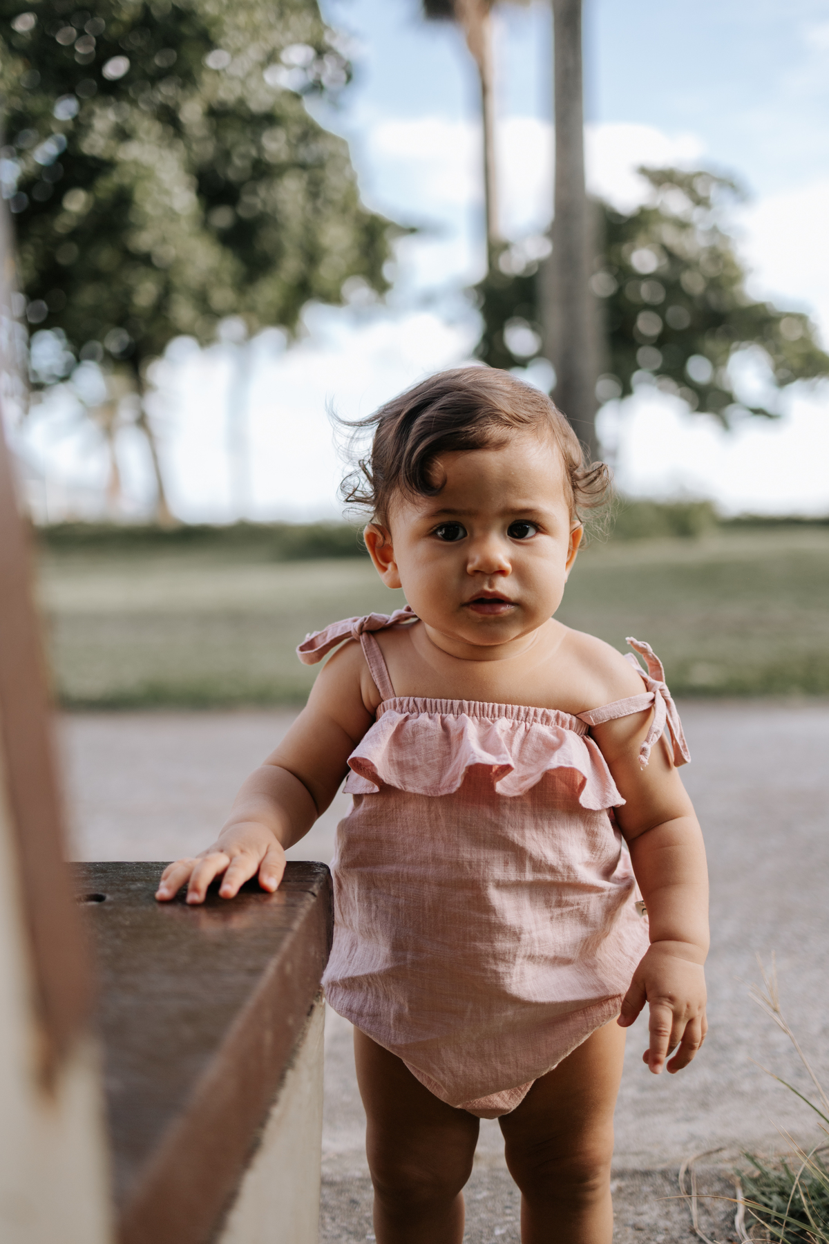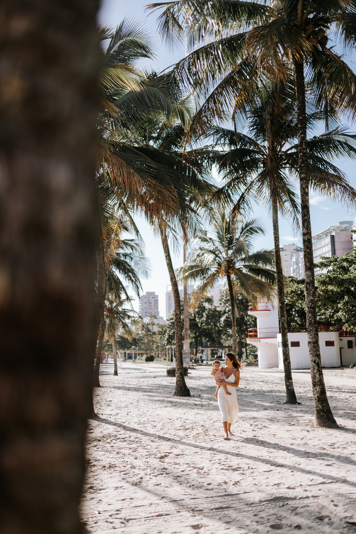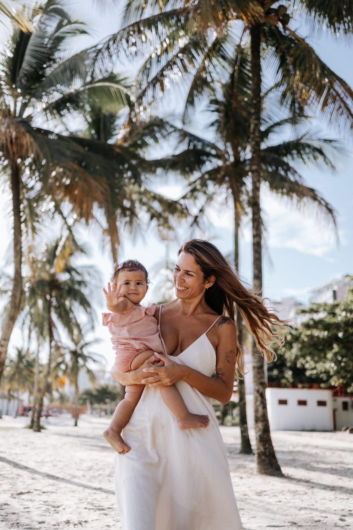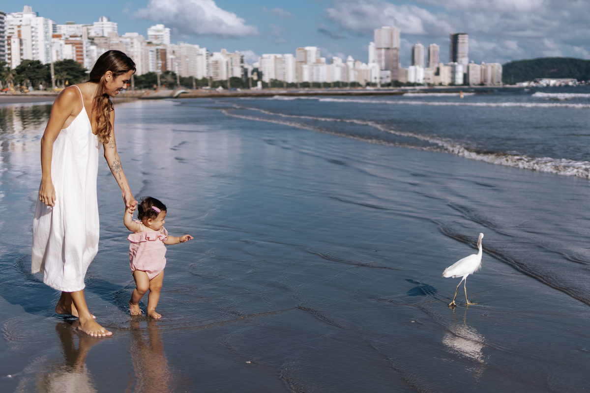 O ensaio de 1 ano da Cecília foi realizado na praia de Santos, em um cenário leve e natural entre a areia e o jardim, criando diferentes momentos para registrar essa fase tão especial.
