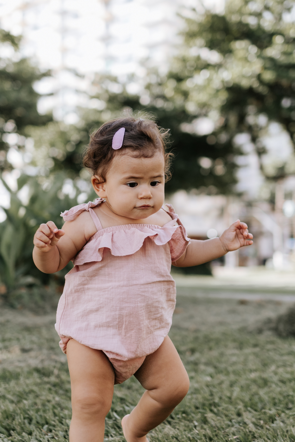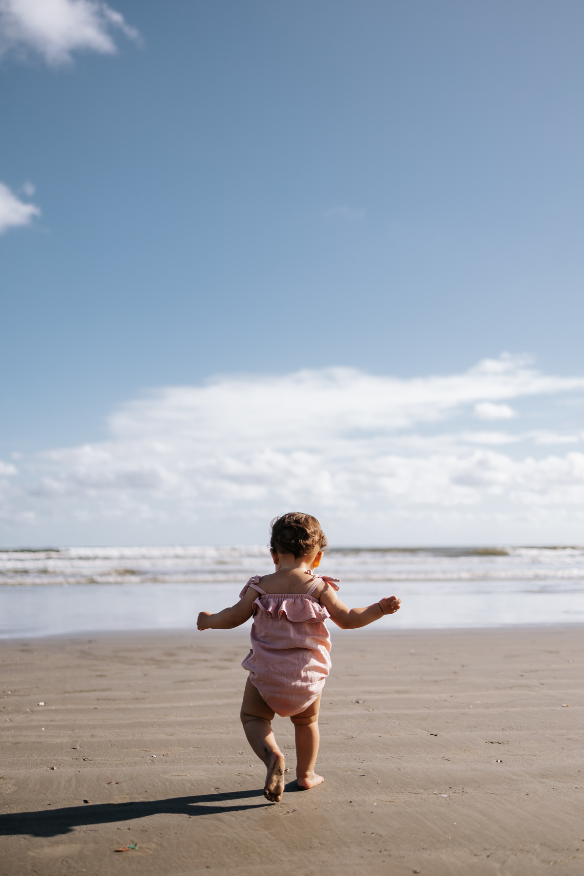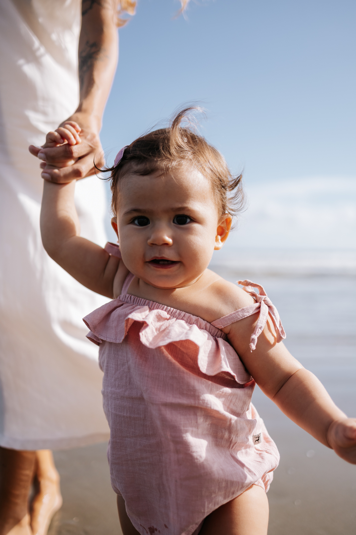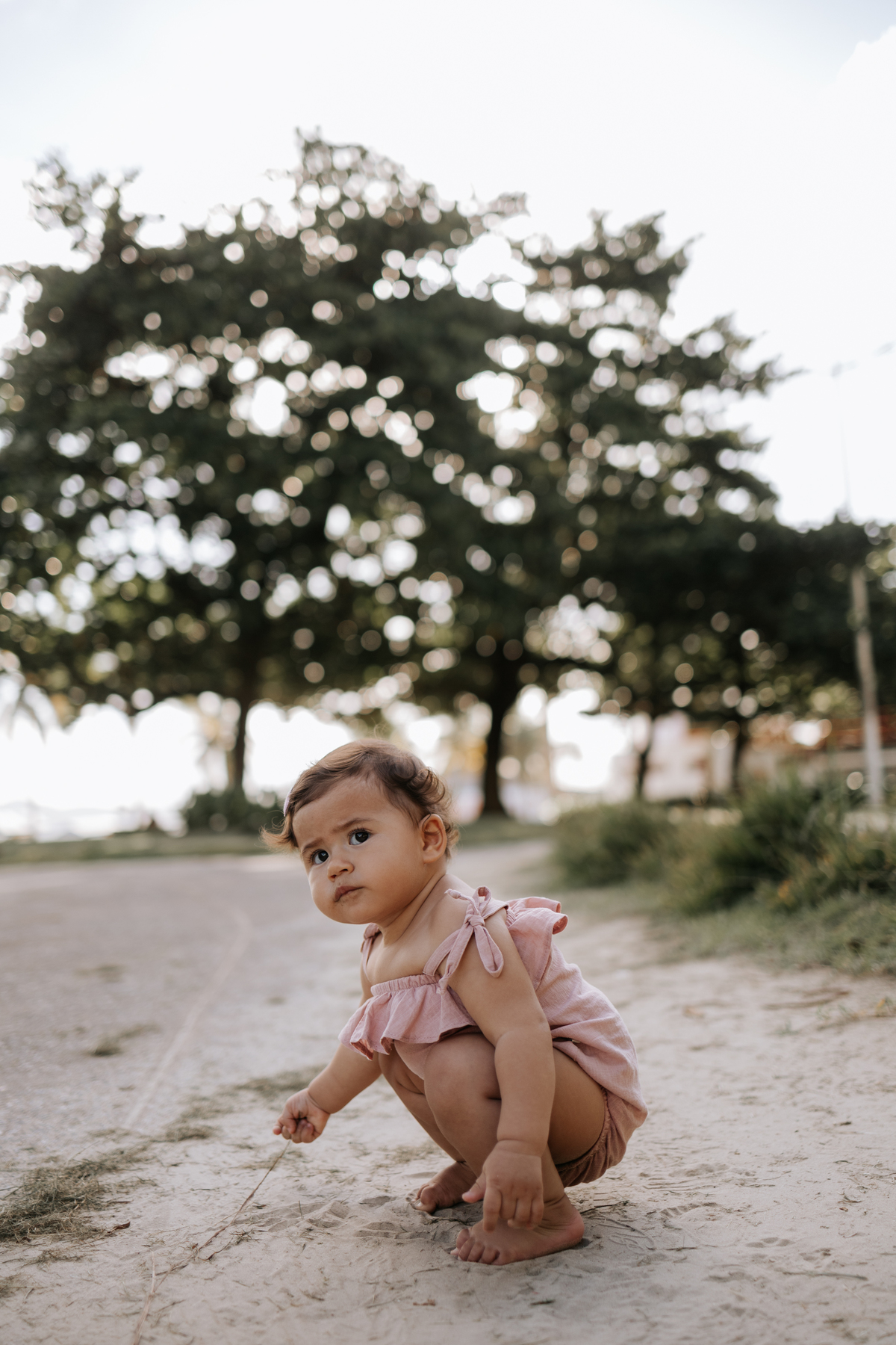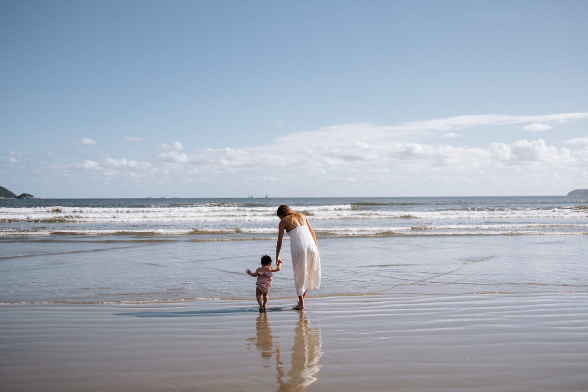 O ensaio de 1 ano da Cecília foi realizado na praia de Santos, em um cenário leve e natural entre a areia e o jardim, criando diferentes momentos para registrar essa fase tão especial.