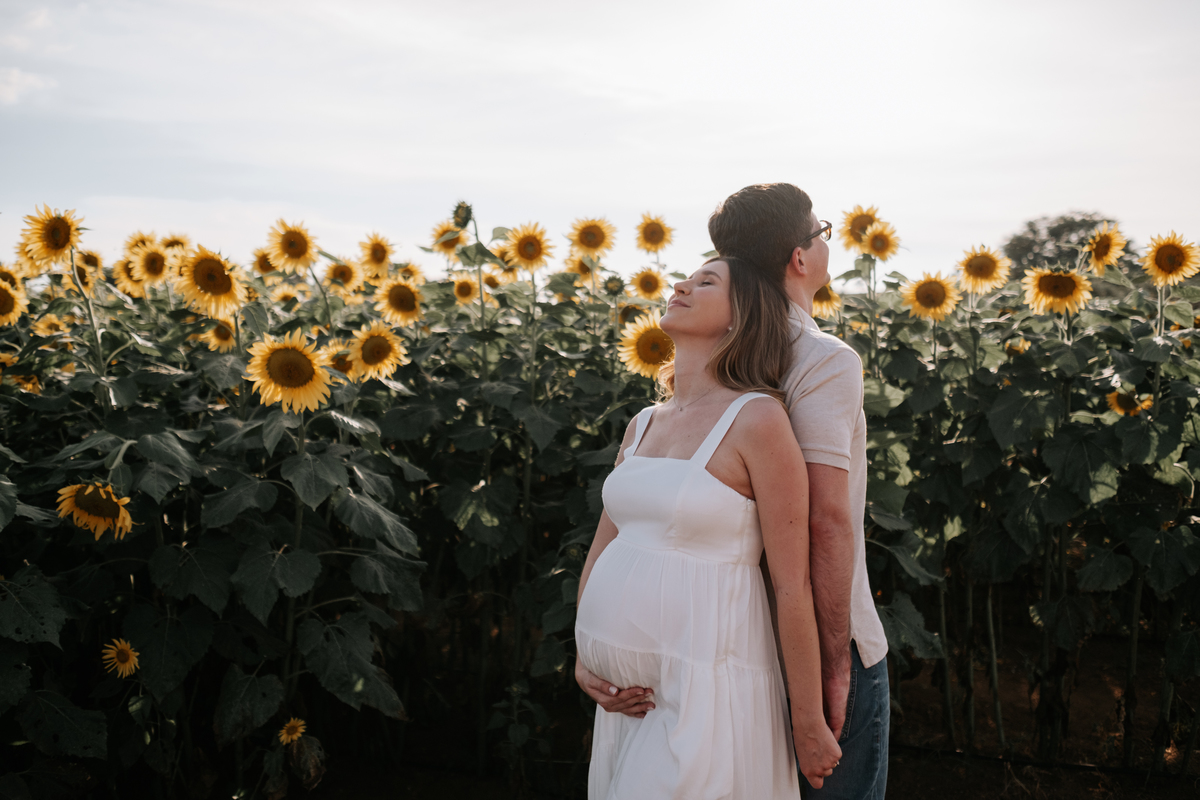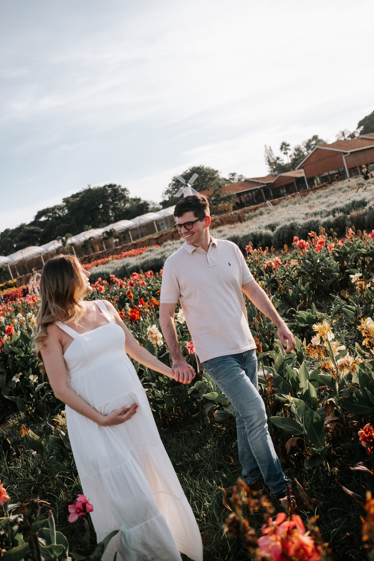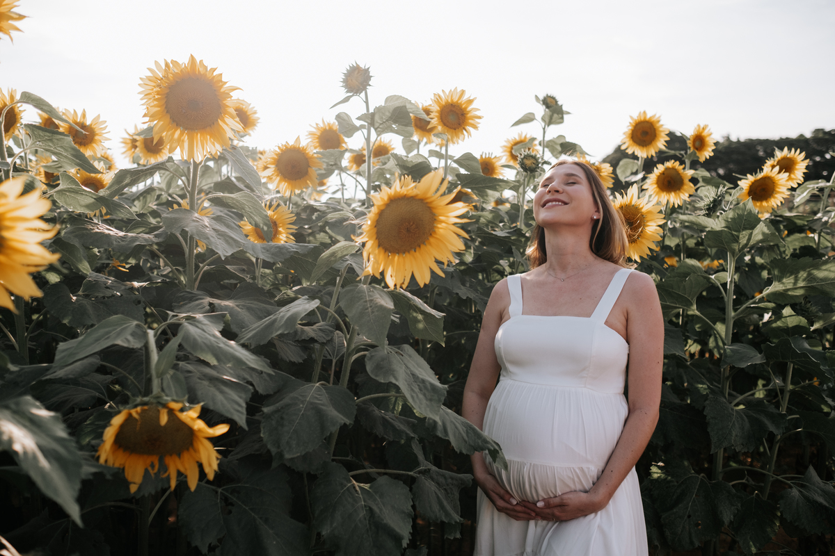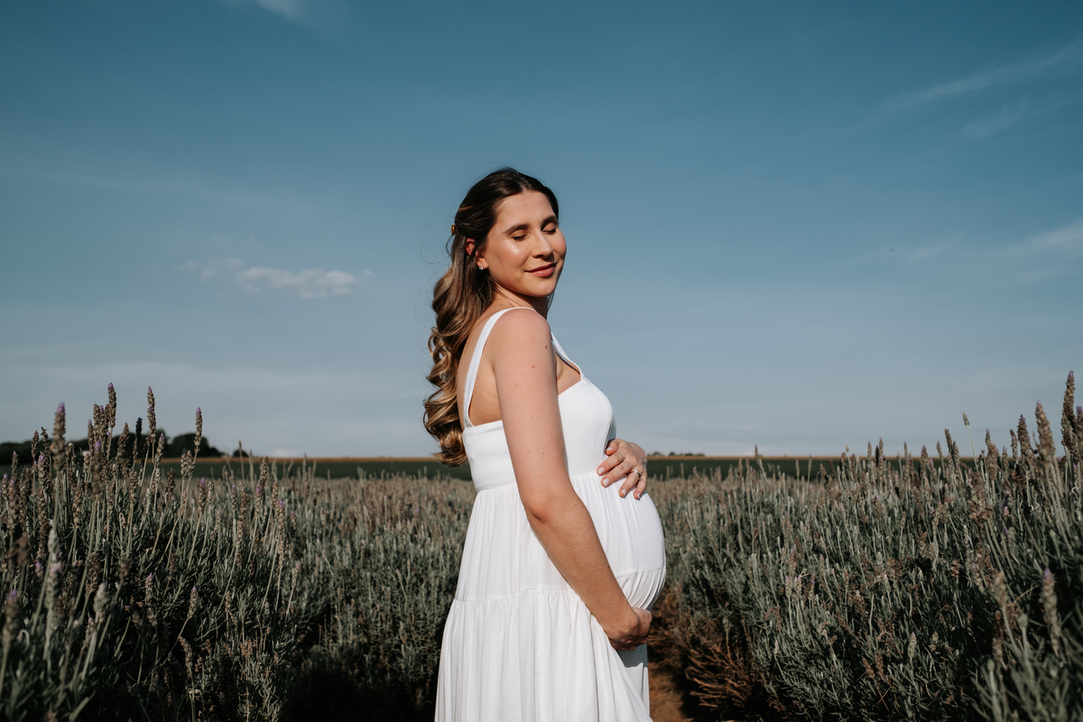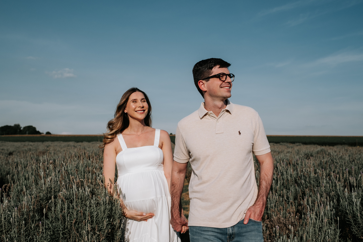O ensaio gestante da Mariane e do Felipe foi realizado em Holambra, em meio à vegetação, criando um cenário natural e acolhedor para registrar a espera pelo Matias.