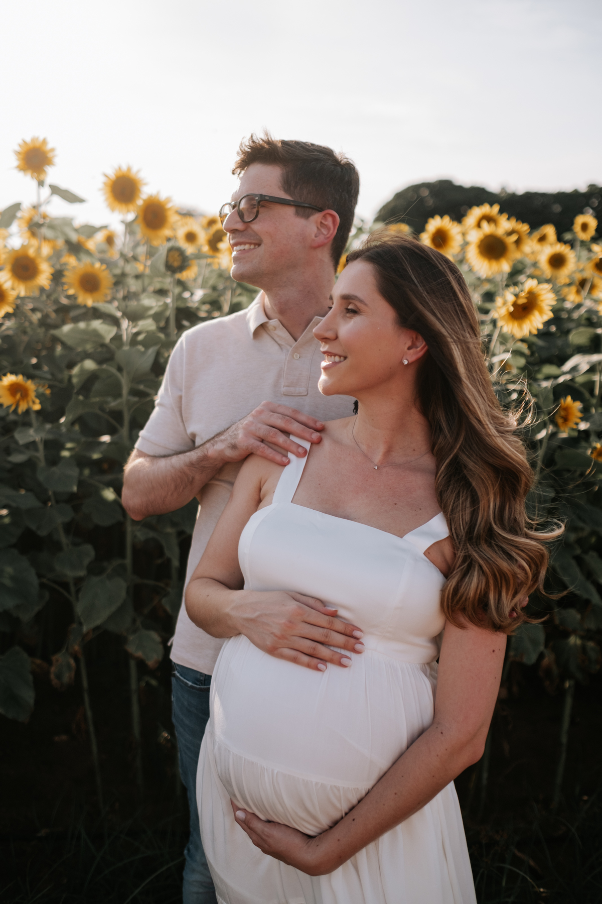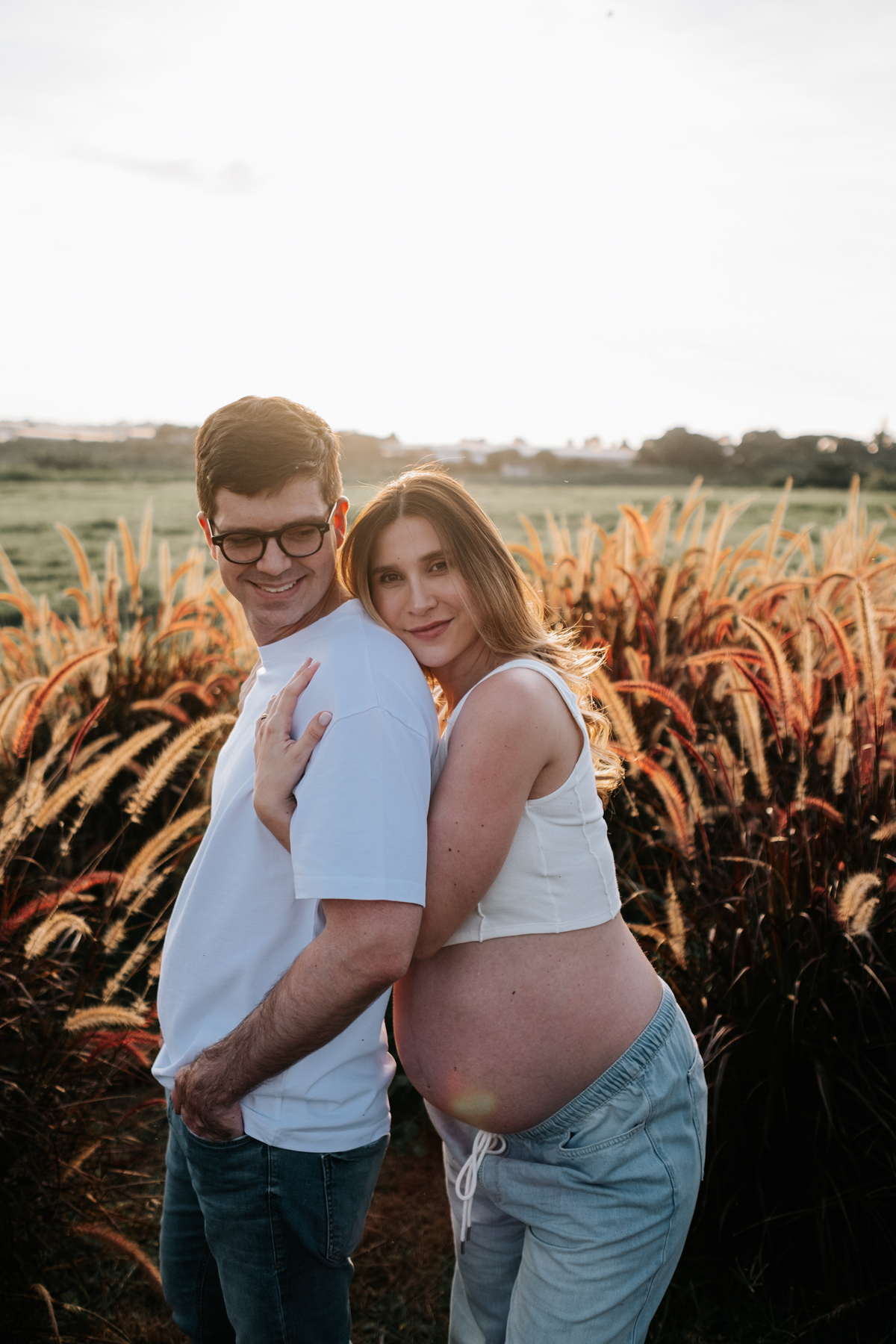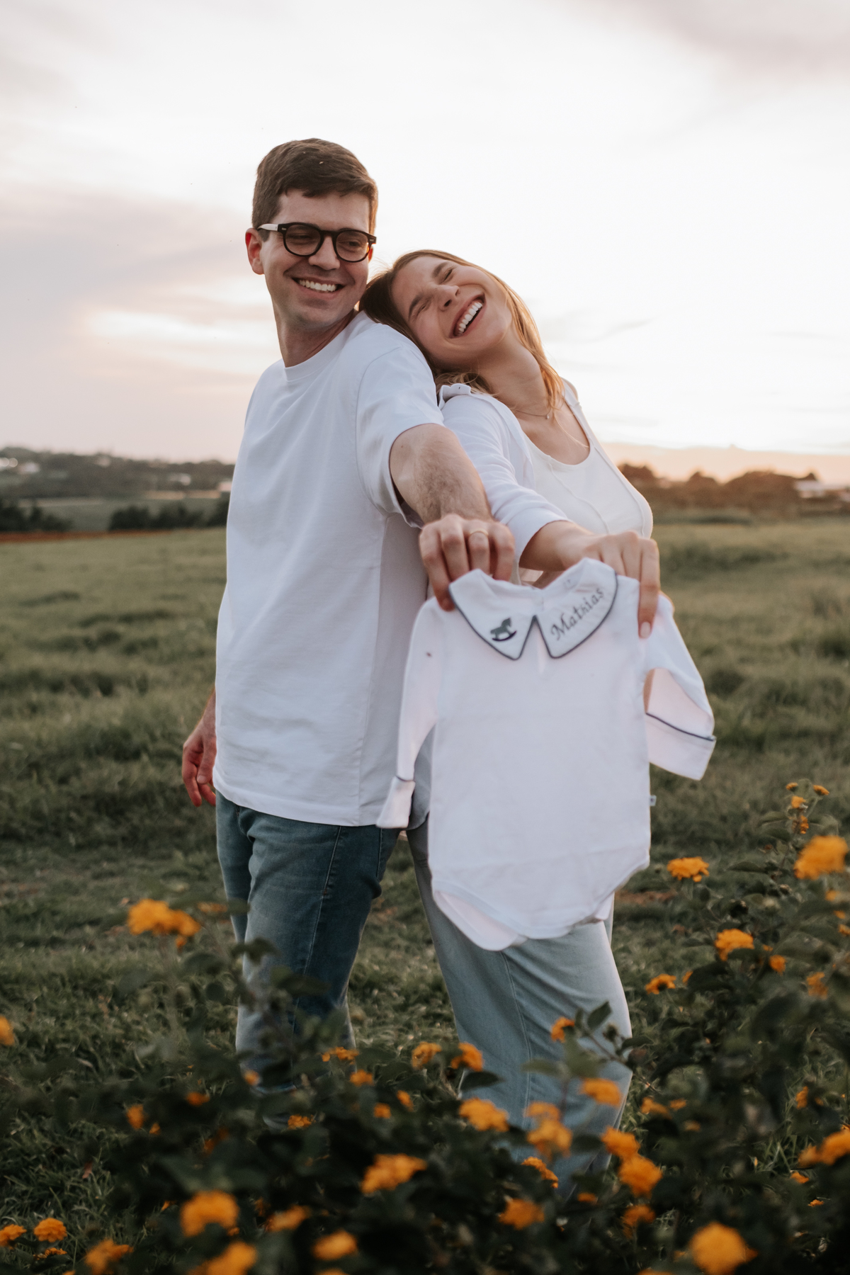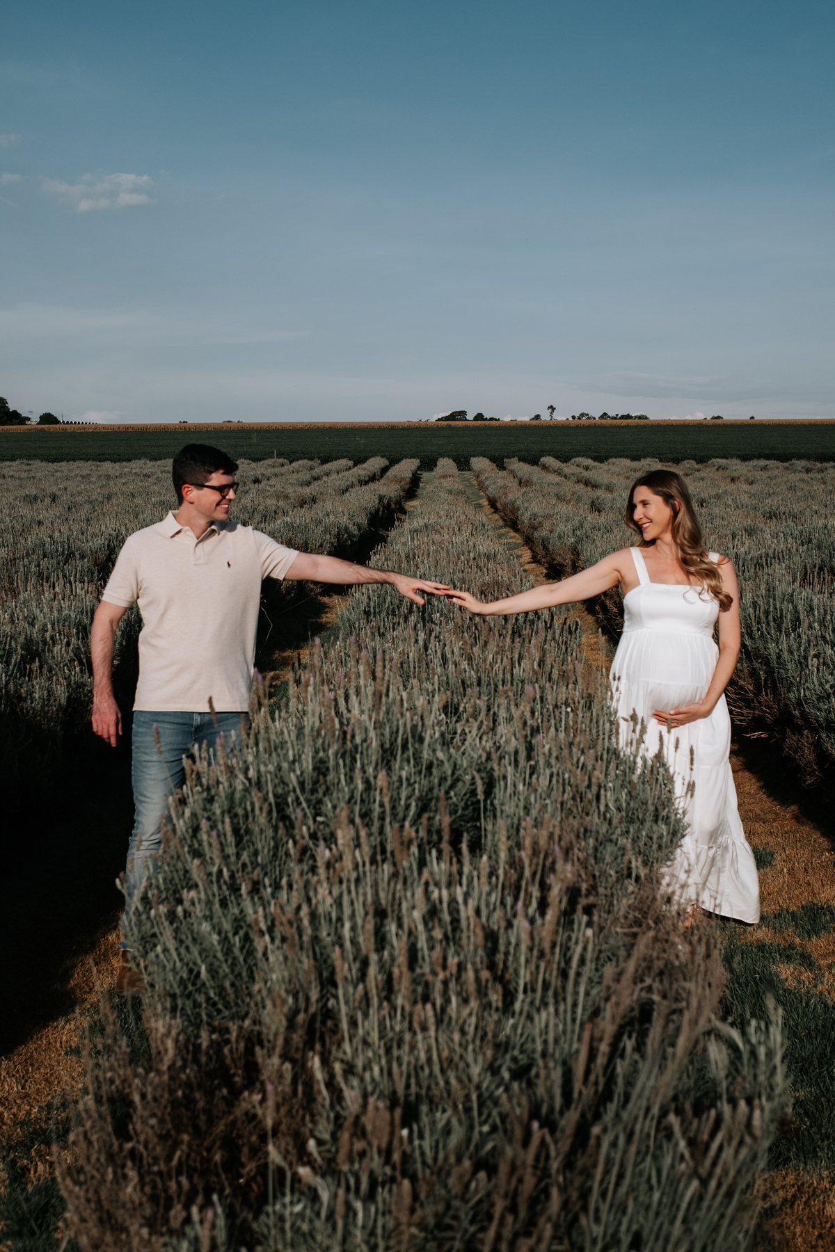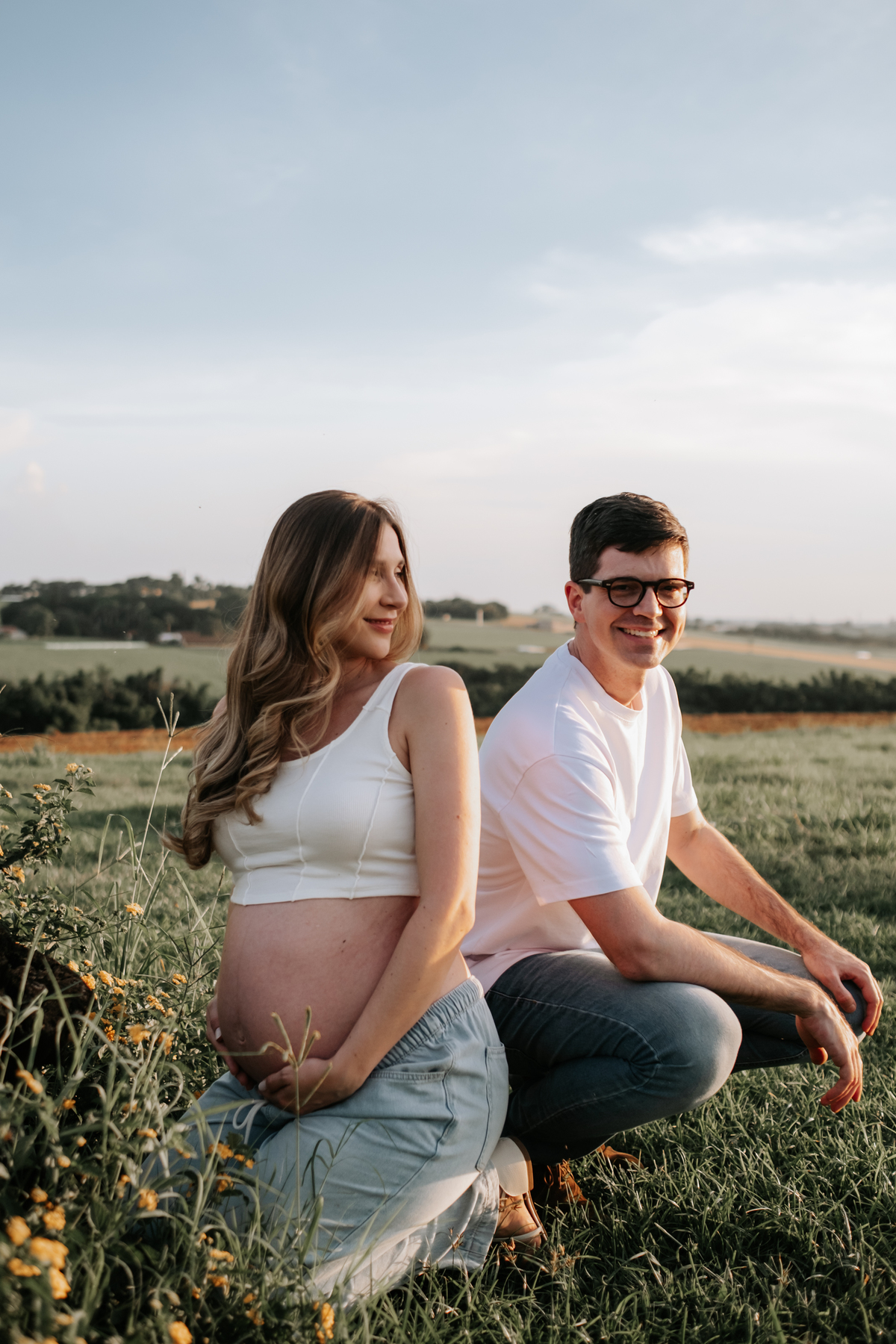 O ensaio gestante da Mariane e do Felipe foi realizado em Holambra, em meio à vegetação, criando um cenário natural e acolhedor para registrar a espera pelo Matias.