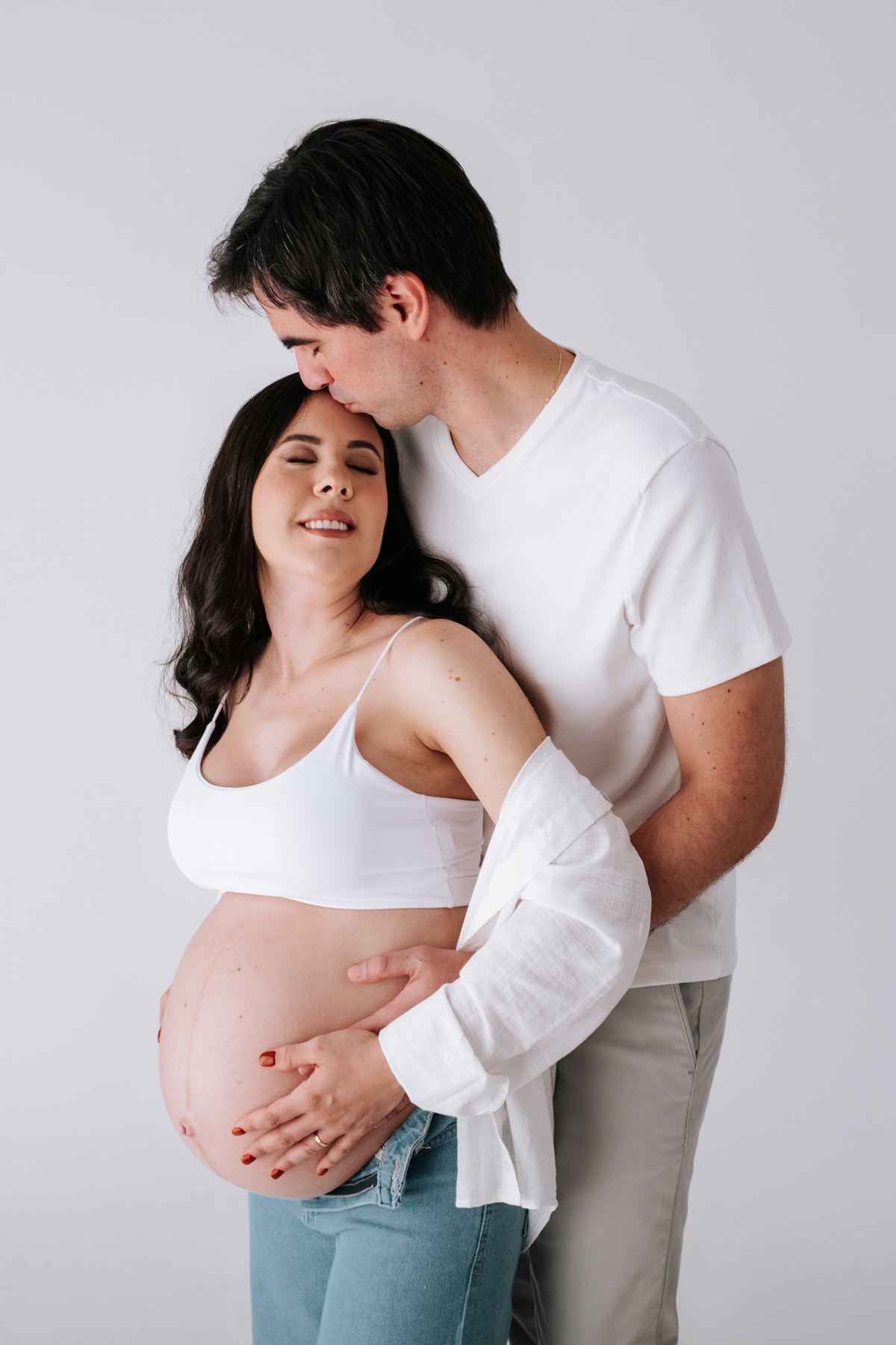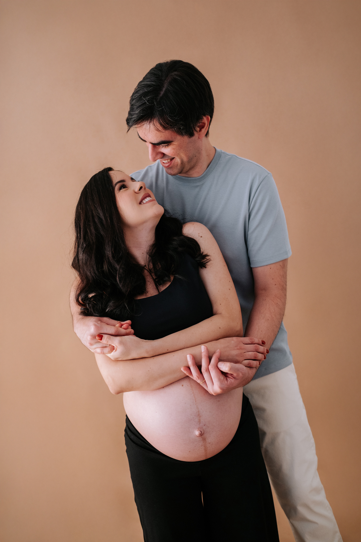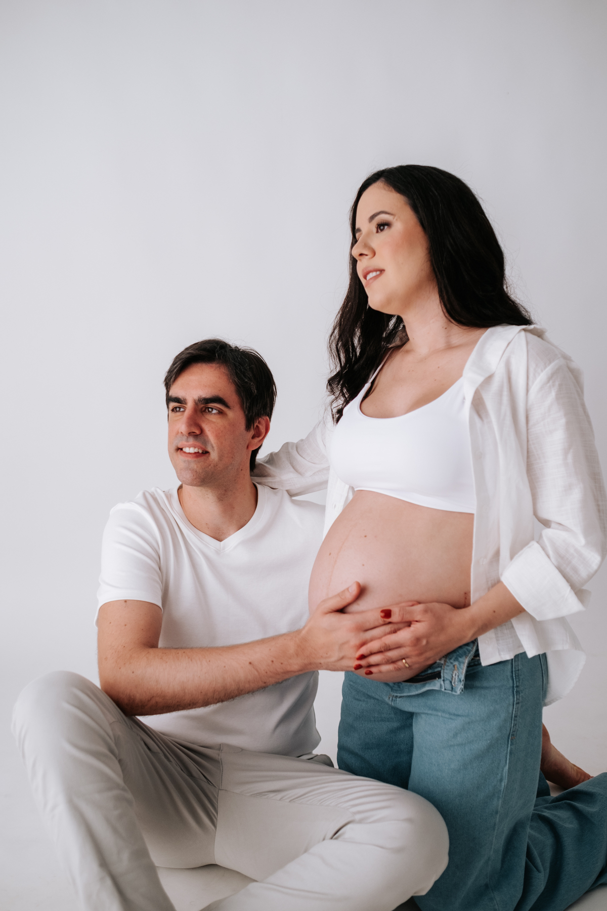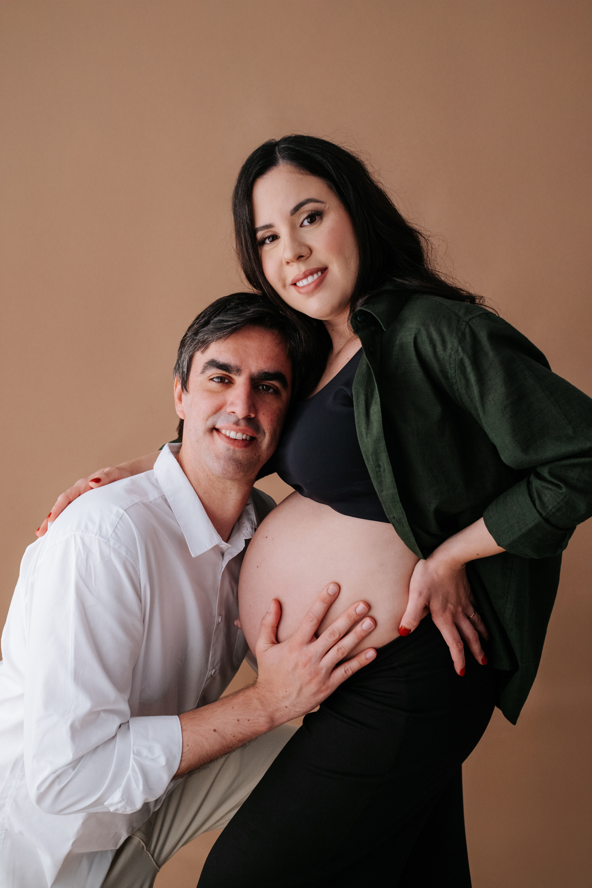 O ensaio gestante da Fernanda e do Humberto foi realizado em estúdio, criando um ambiente acolhedor e atemporal para registrar a espera pelo Arthur.