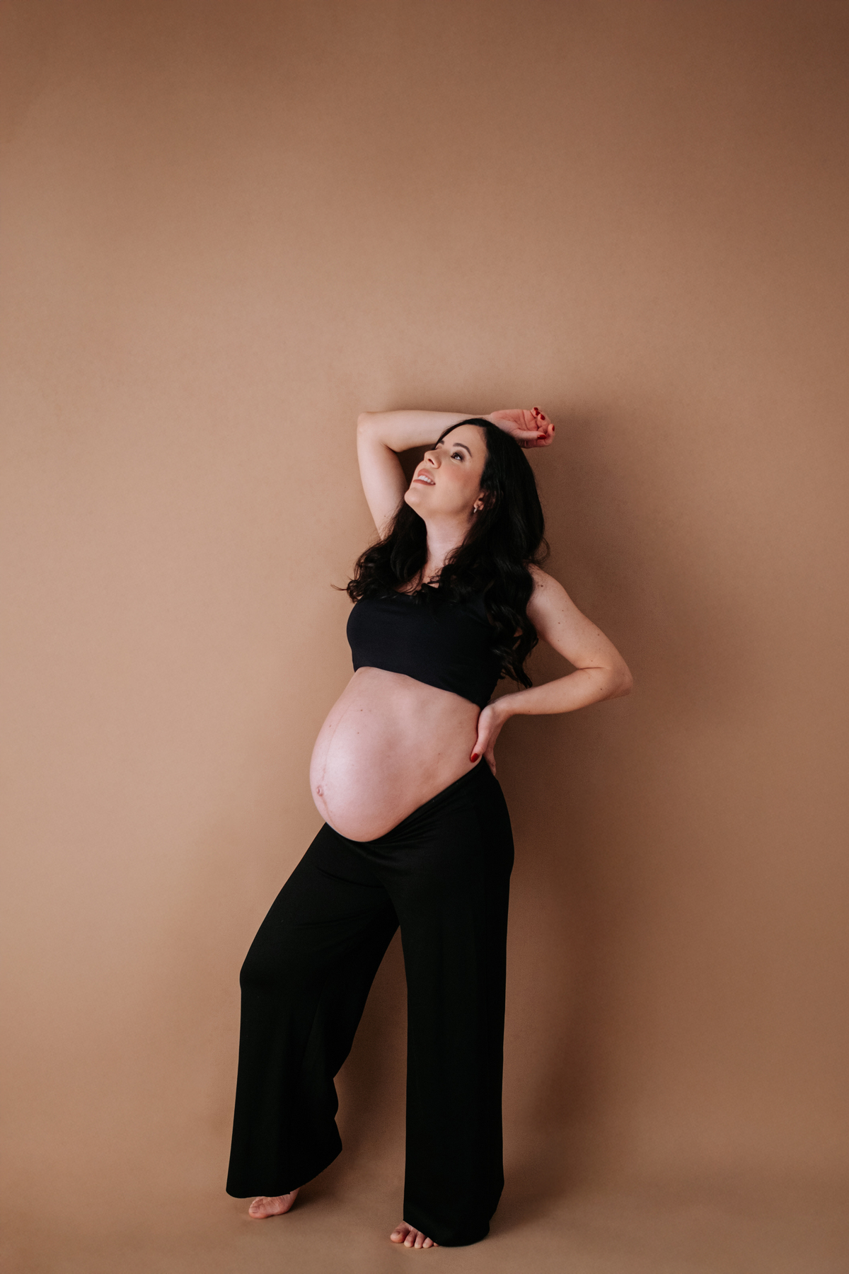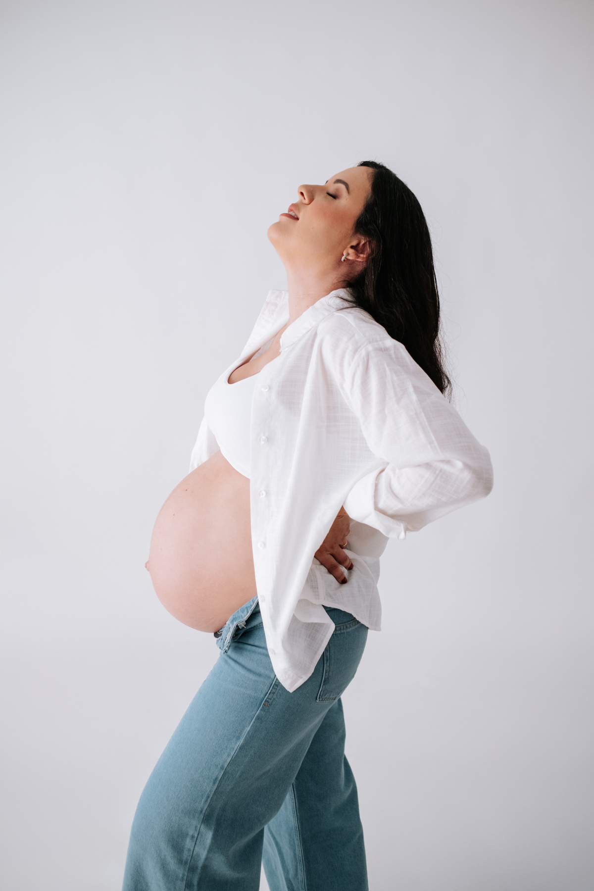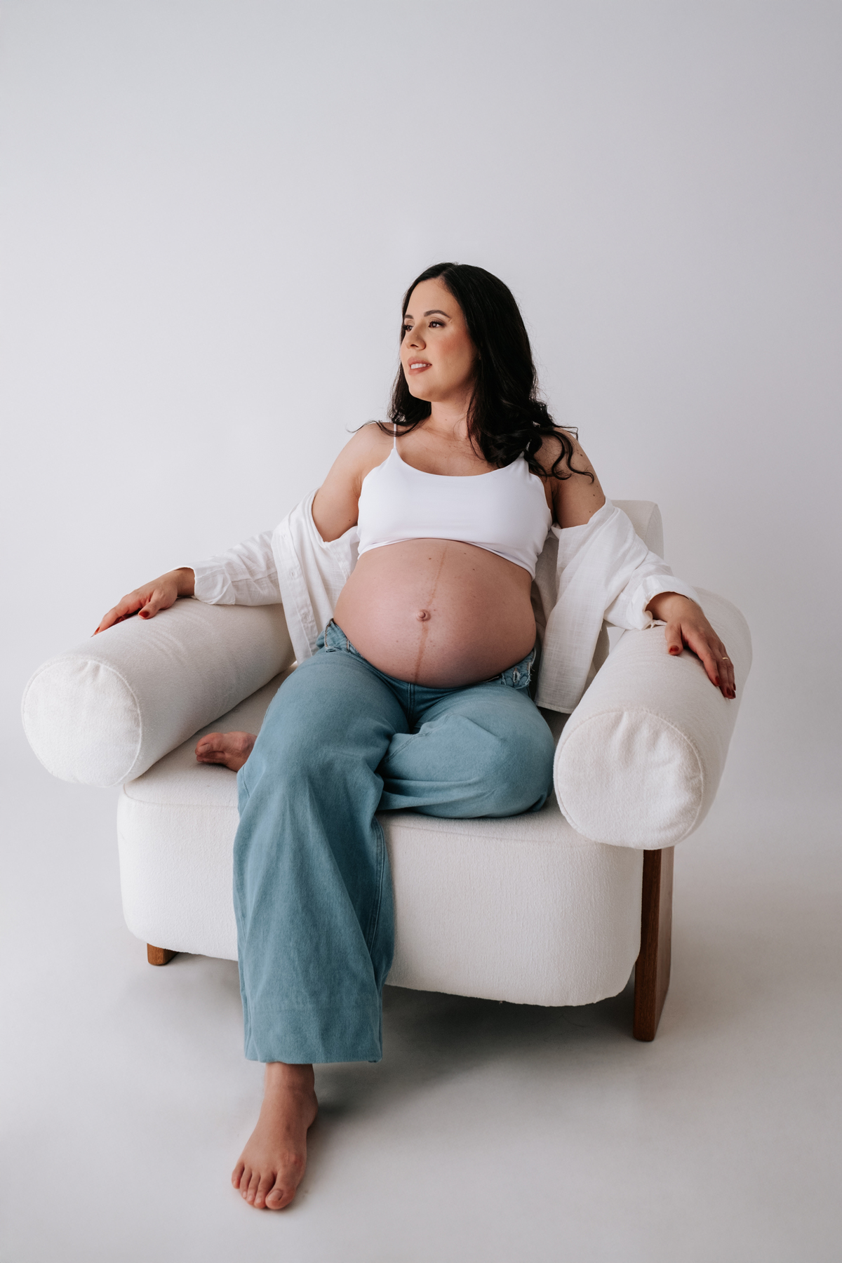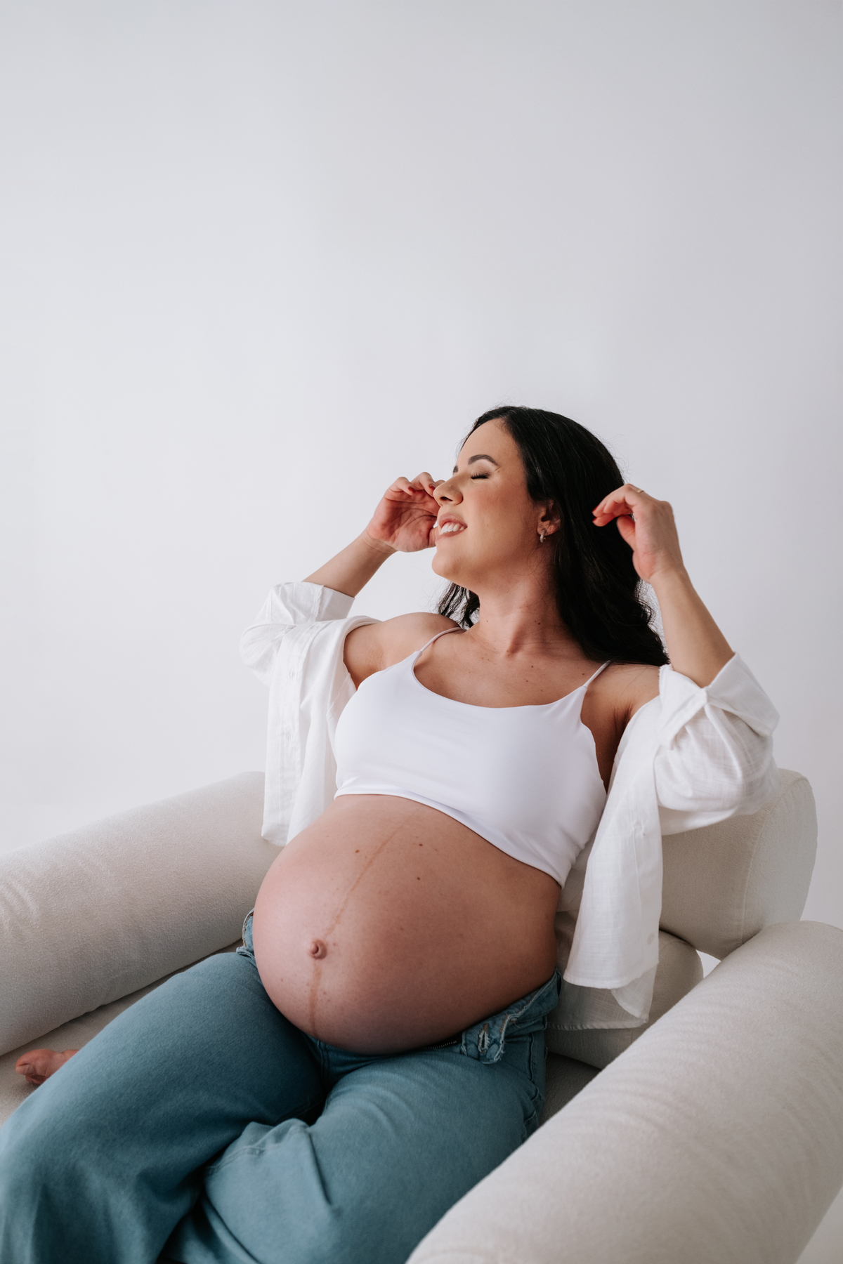 O ensaio gestante da Fernanda e do Humberto foi realizado em estúdio, criando um ambiente acolhedor e atemporal para registrar a espera pelo Arthur.