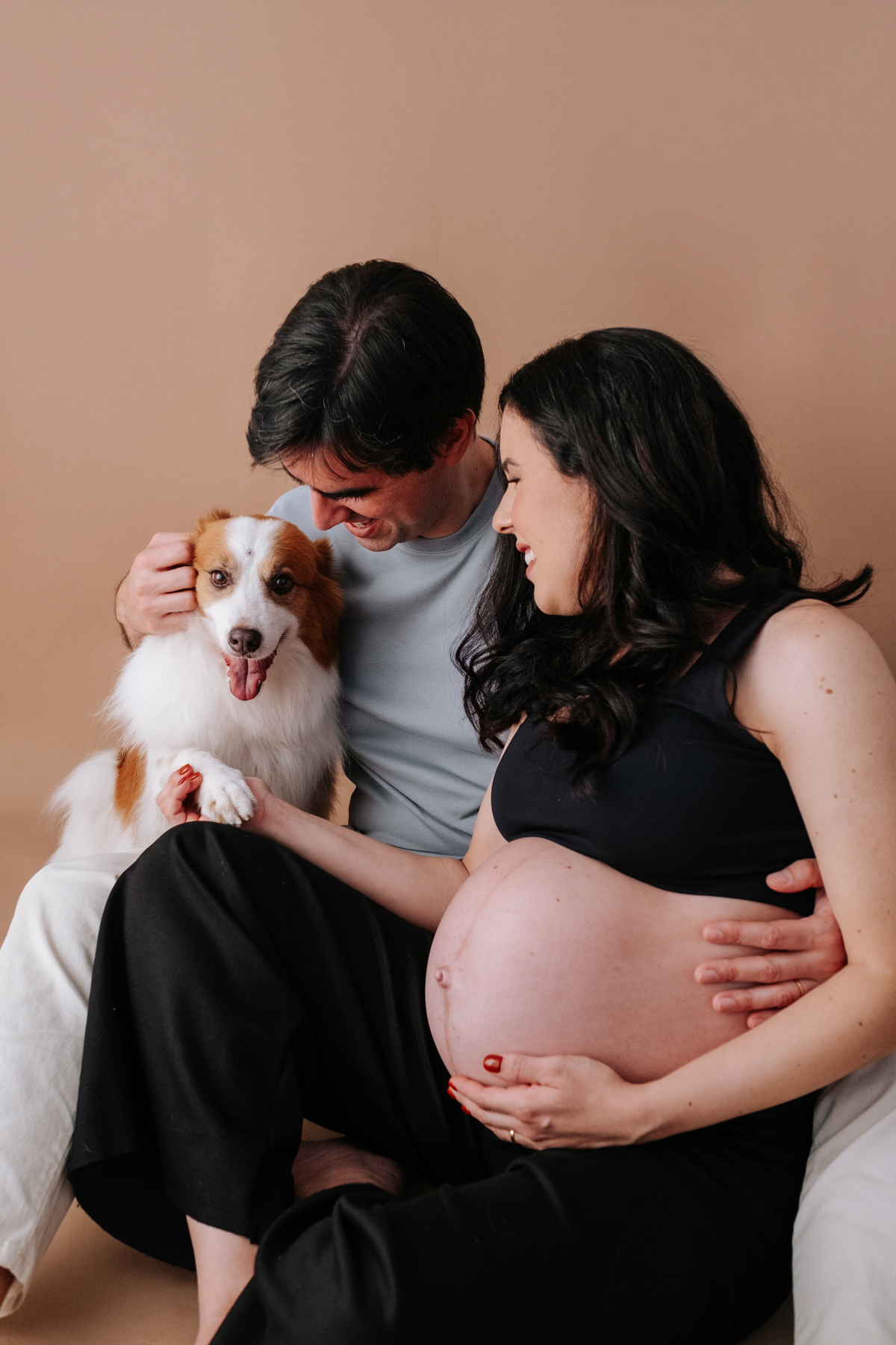Ao lado do pet do casal, que também participou desse momento especial, o ensaio aconteceu de forma leve e espontânea, com muita conexão e carinho entre a família.