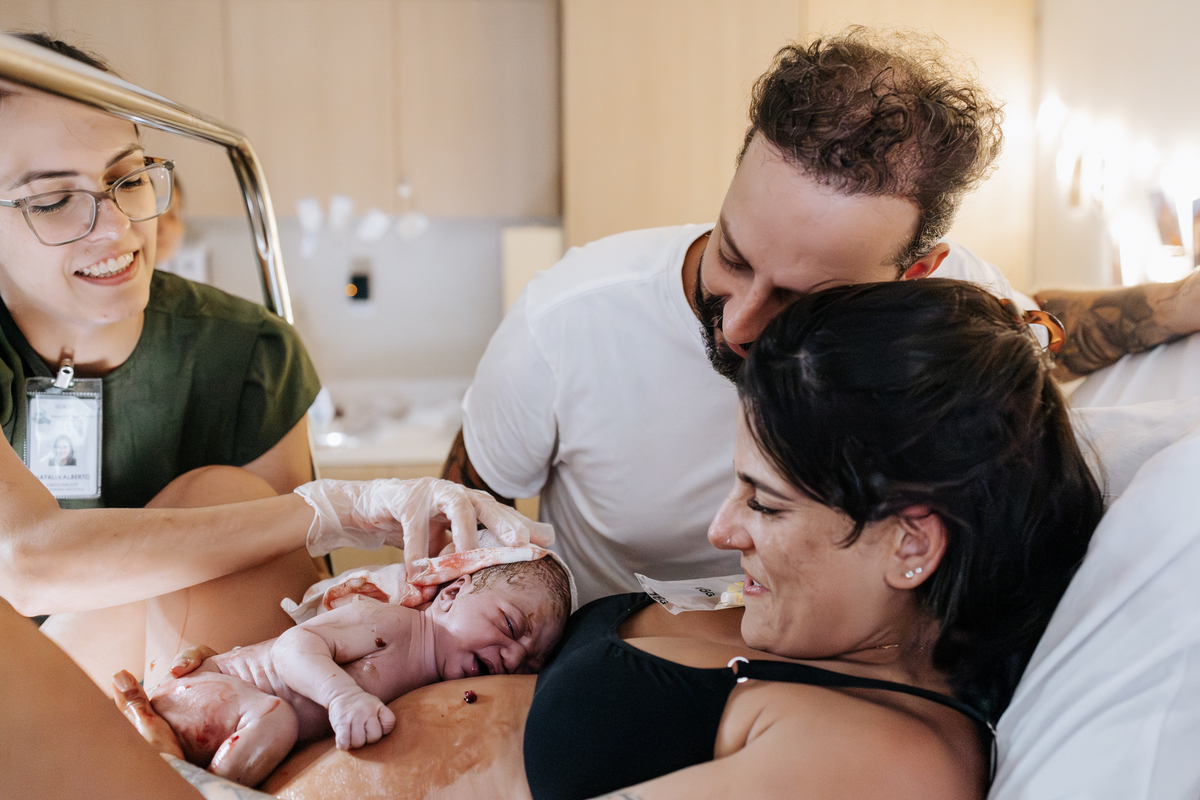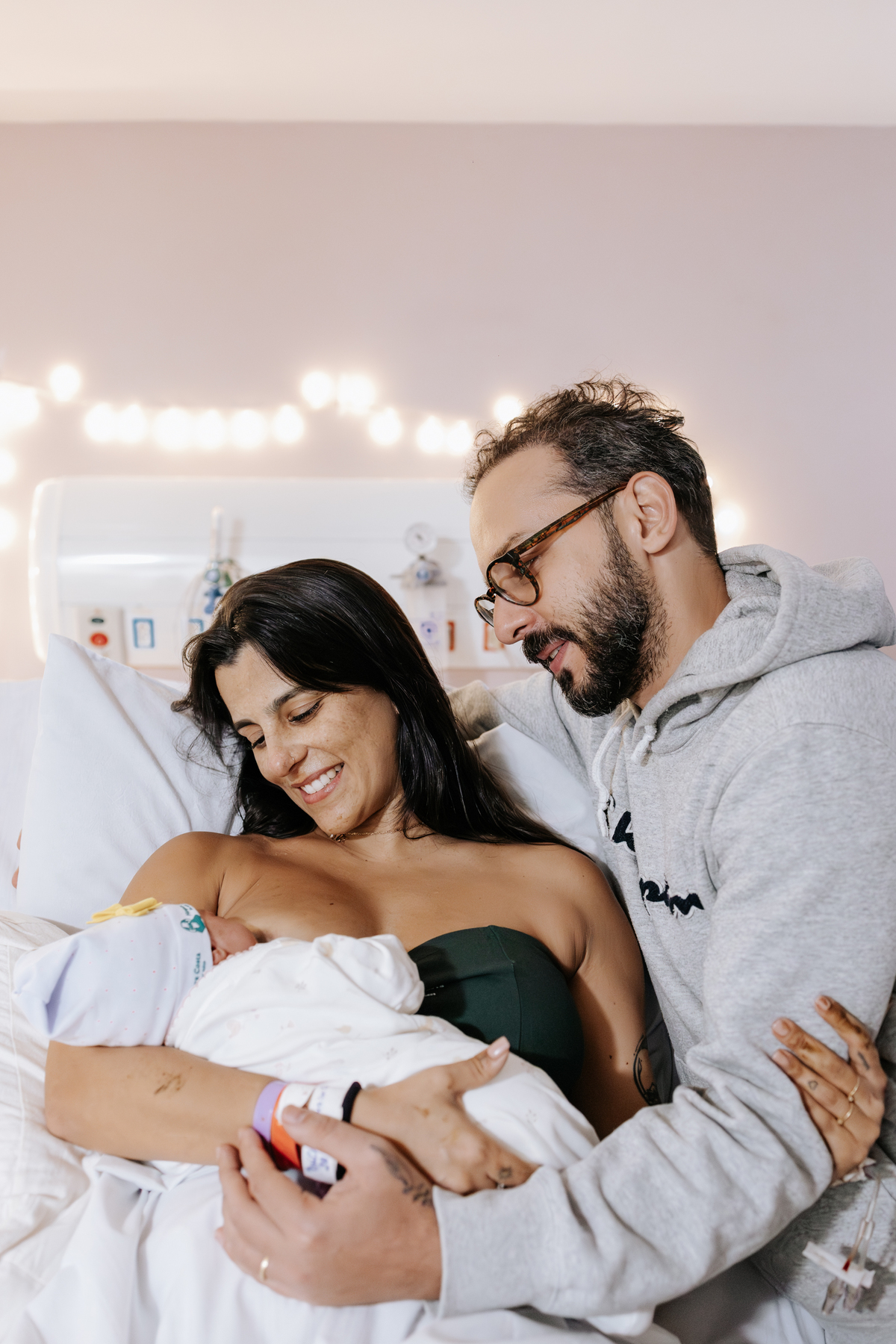 Entre a intensidade do trabalho de parto e os primeiros instantes com a bebê, construímos um registro completo, com fotos e vídeo de parto normal, sem interferir no que está acontecendo.
