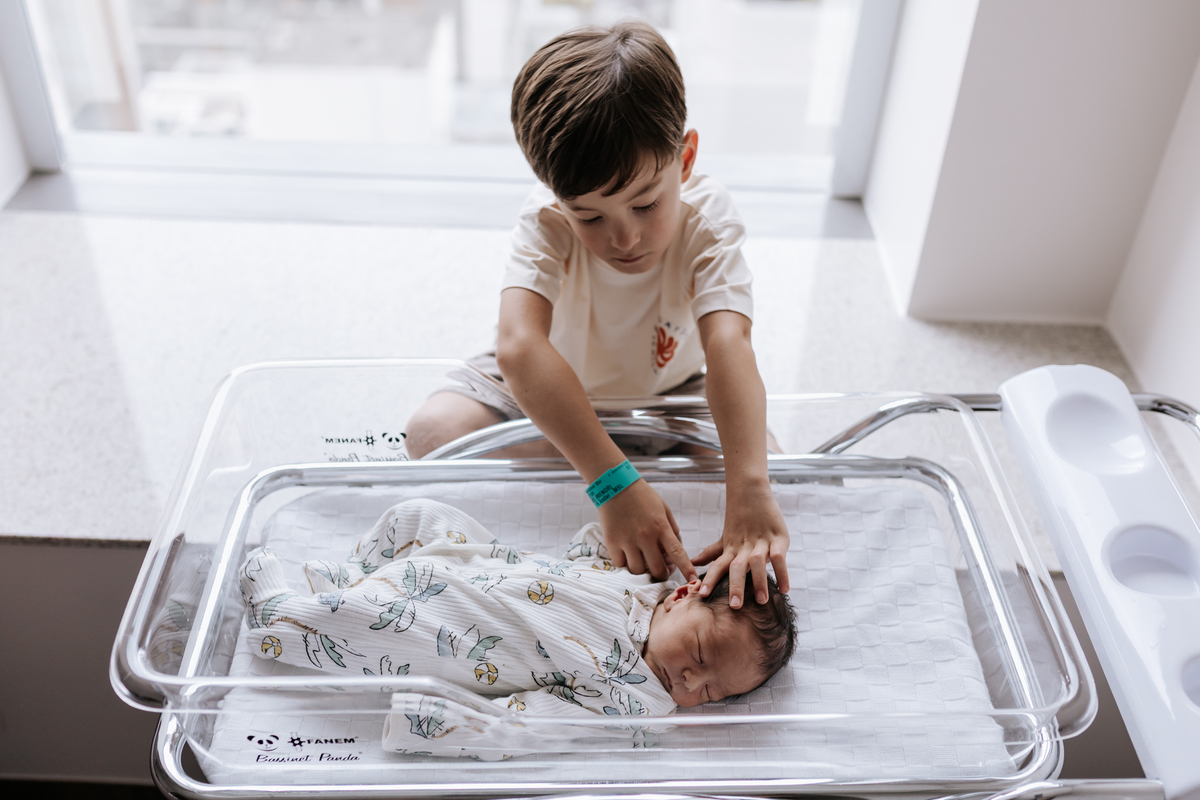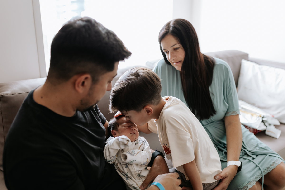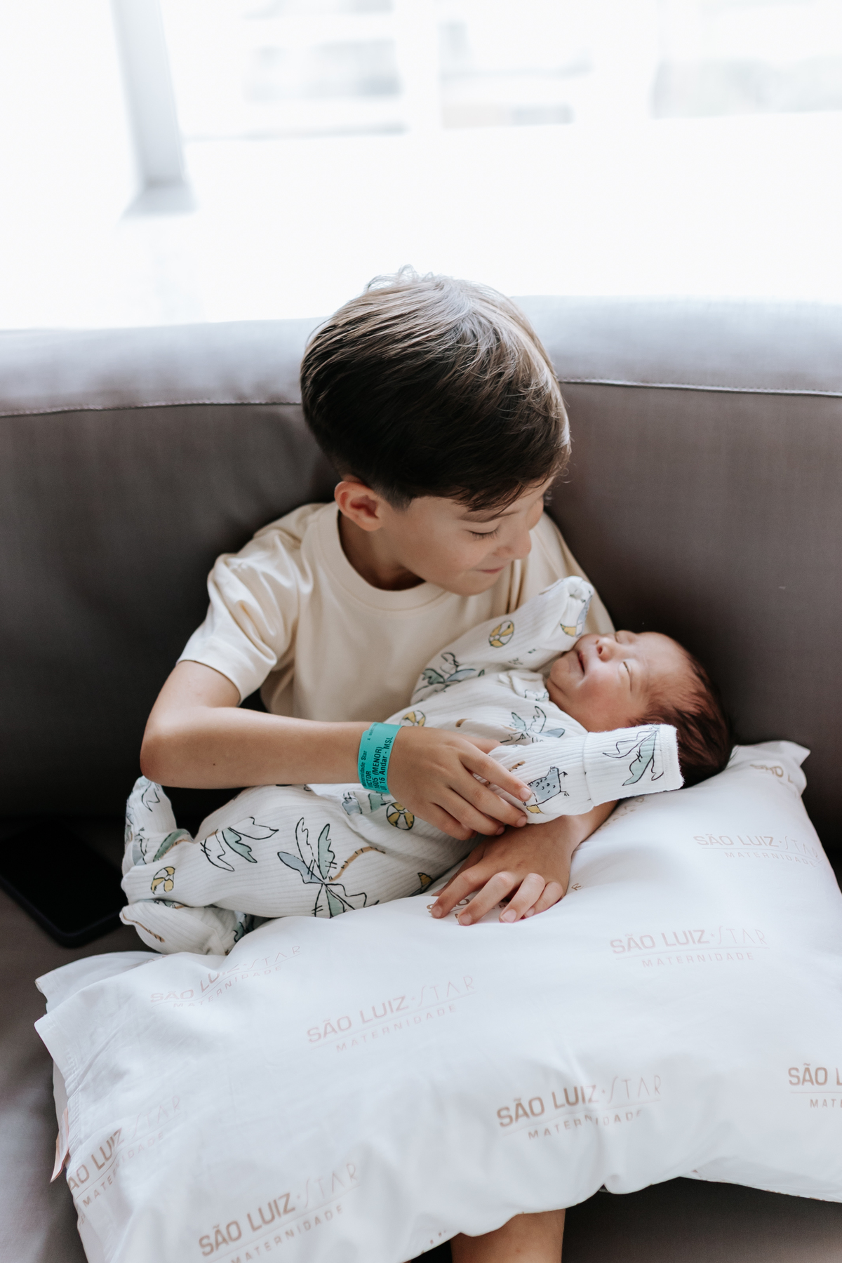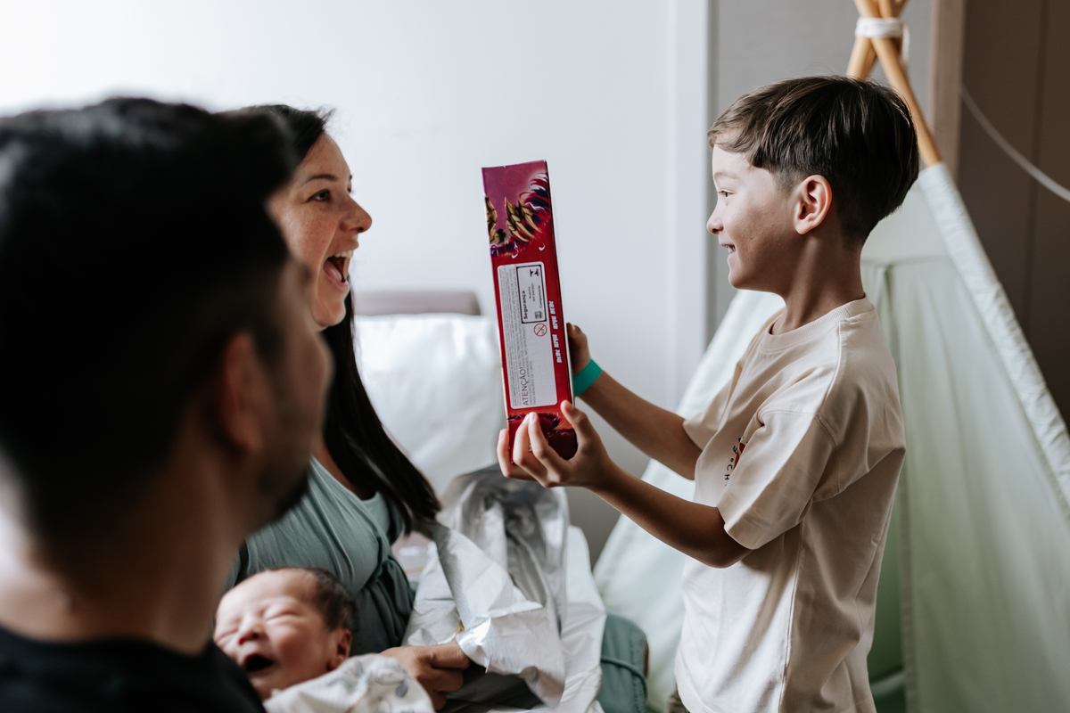 No dia seguinte, retornamos à maternidade para acompanhar um momento especial: o encontro do irmão João Pedro, de 5 anos, com o Joaquim. Um registro cheio de carinho, descobertas e conexão entre os irmãos.