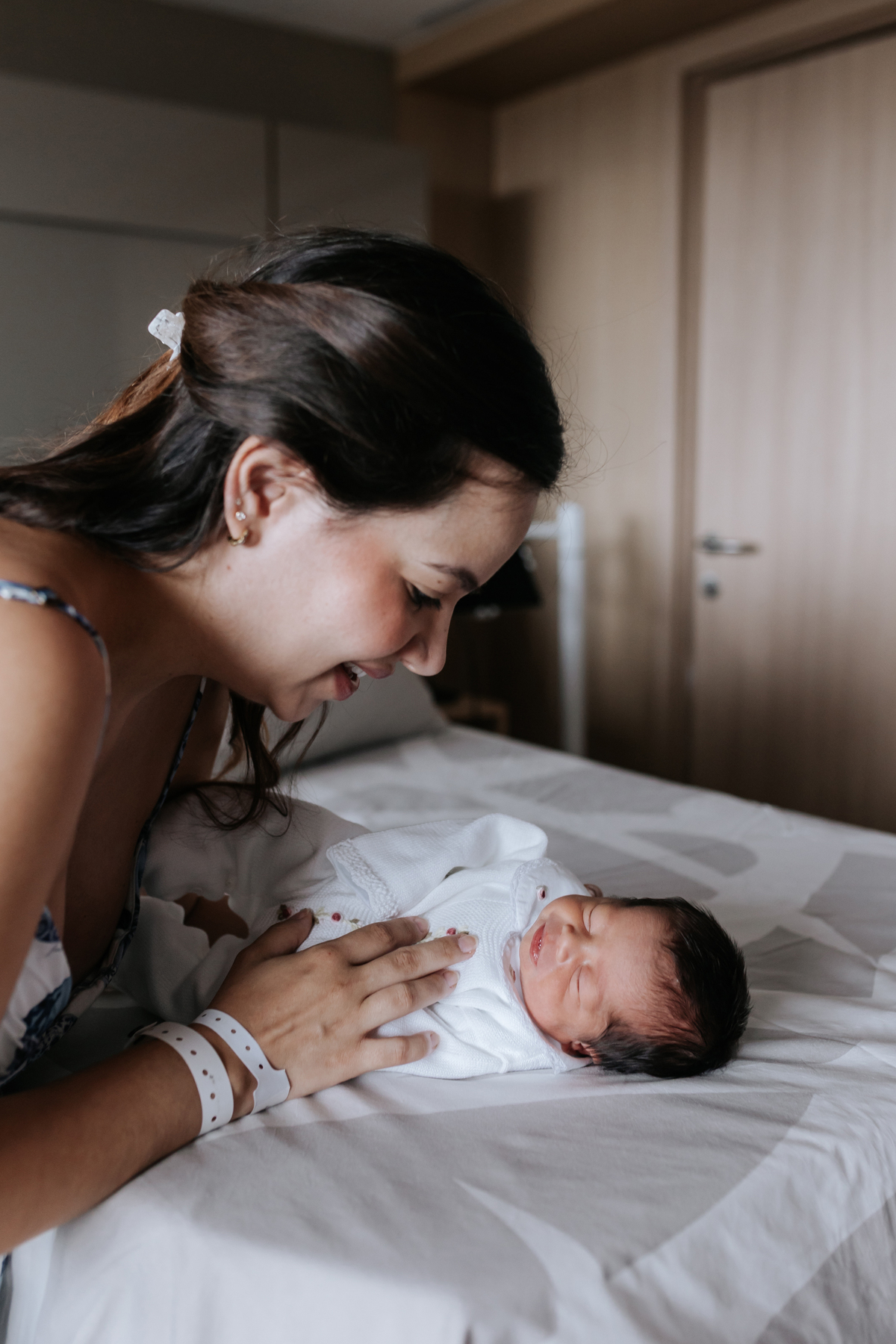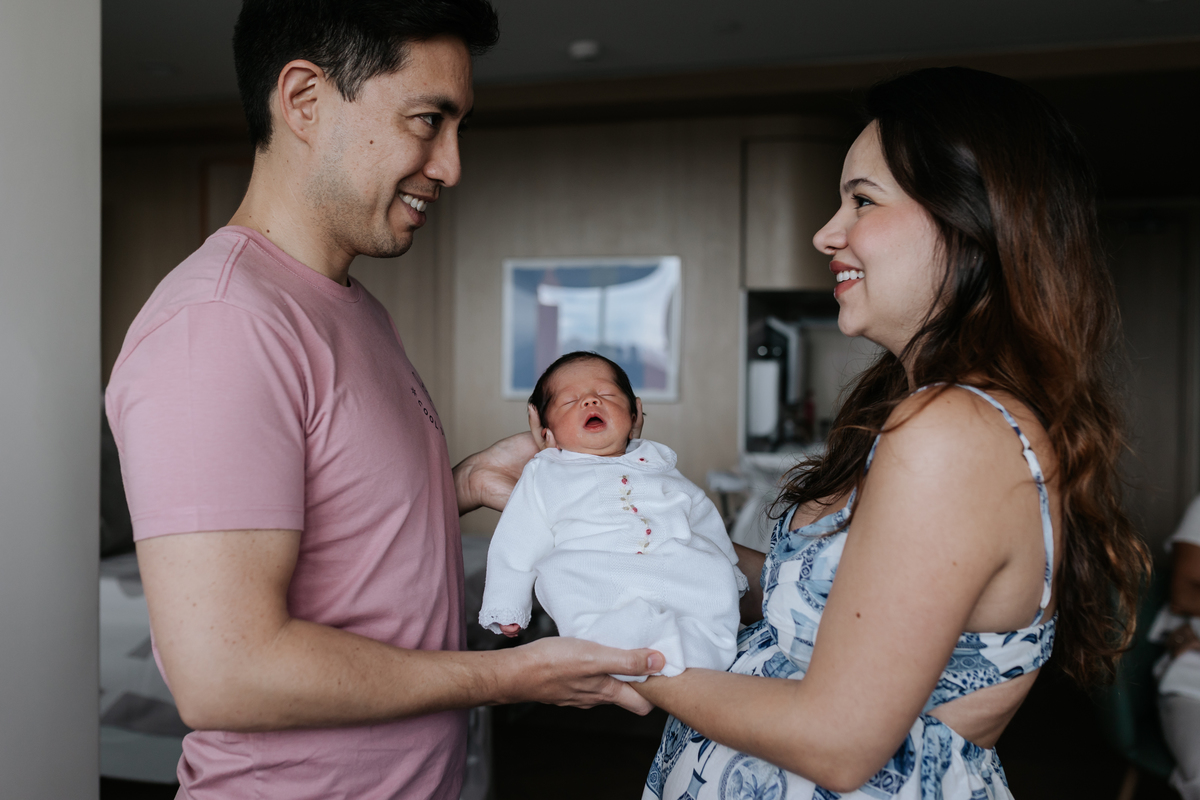 No dia seguinte ao nascimento da Bianca, realizamos o registro no quarto da maternidade Albert Einstein, acompanhando os primeiros momentos de vida ao lado dos pais Mariana e Hugo.