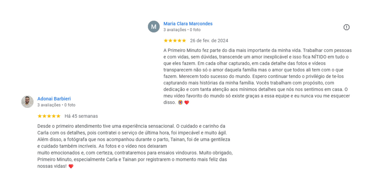 A Primeiro Minuto é uma empresa avaliada com nota máxima no Google — 5 estrelas em mais de 170 avaliações. Cada uma dessas histórias carrega a confiança de famílias que viveram esse momento conosco.