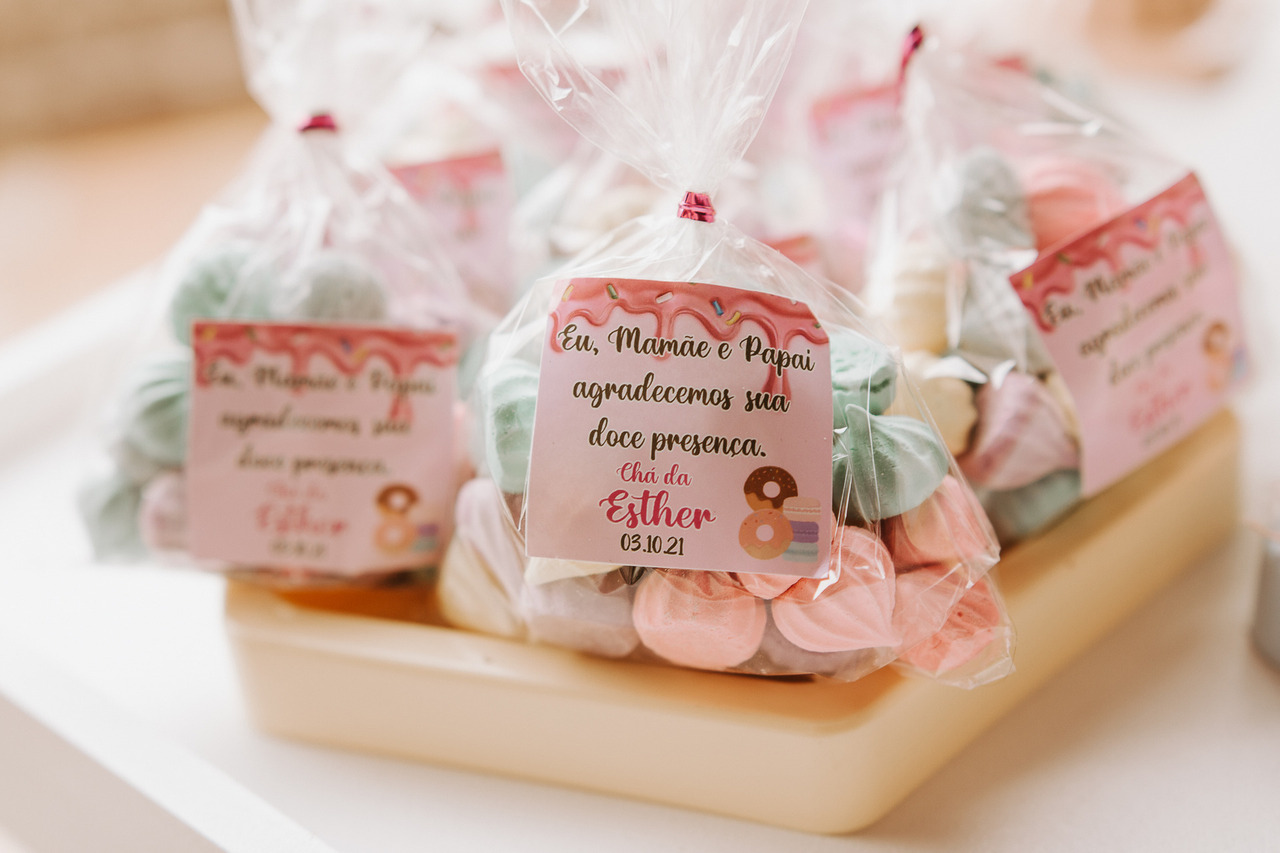 Lembrancinhas personalizadas podem sair mais caras, mas você pode optar pelas tags de papel para dar um acabamento final, colocando apenas o nome do bebê, a data e o agradecimento pela presença.